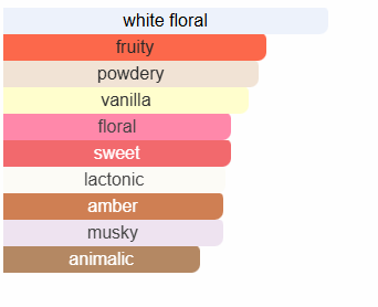 - Base: Vanilla, Ambergris, Sandalwood